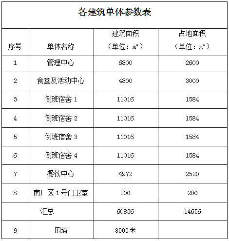 采購項目內(nèi)容包括:管理中心、食堂及活動中心、倒班宿舍(暫定四棟)、餐飲中心、南廠區(qū)門衛(wèi)室、圍墻立面概念設(shè)計,各單體參數(shù)如下表: