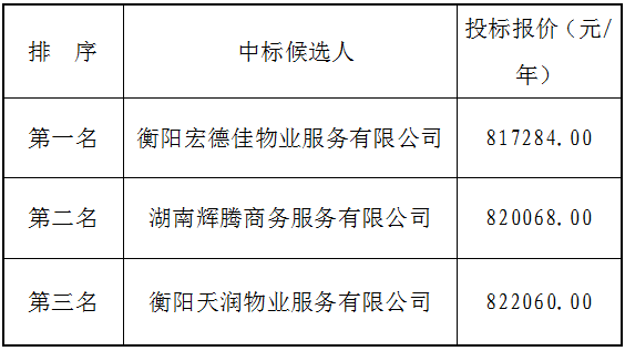衡陽弘湘國有投資(控股)集團有限公司院內(nèi)物業(yè)服務采購項目中標候選人公示