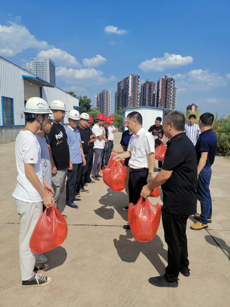 “火熱的天氣,你們堅(jiān)守戶外一線,為衡陽的建設(shè)和發(fā)展付出了辛勤的汗水,大家辛苦了!”8月24日下午,黨委書記、董事長劉軍同志來到幸福河項(xiàng)目建設(shè)工地,看望慰問奮戰(zhàn)在高溫一線的勞動者,切實(shí)落實(shí)市總工會衡工發(fā)〔2020〕23 號文《關(guān)于開展 2020 年“夏送清涼”活動的通知》工作安排,把黨委和工會的關(guān)愛和“清涼”一起送到一線職工、農(nóng)民工的心坎上。
