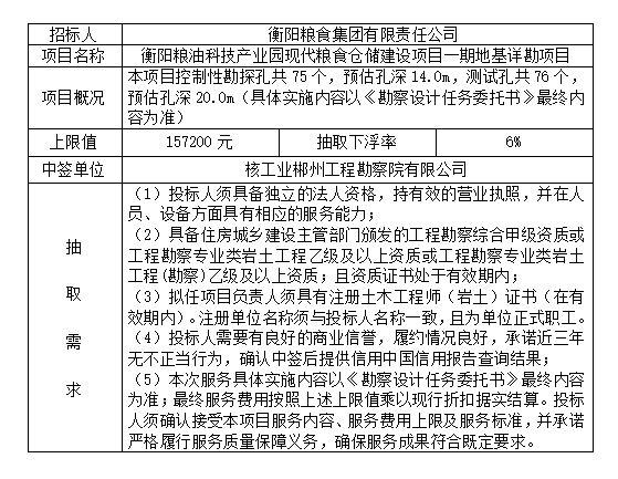 衡陽糧油科技產(chǎn)業(yè)園現(xiàn)代糧食倉儲(chǔ)建設(shè)項(xiàng)目一期地基詳勘項(xiàng)目抽取結(jié)果公示
