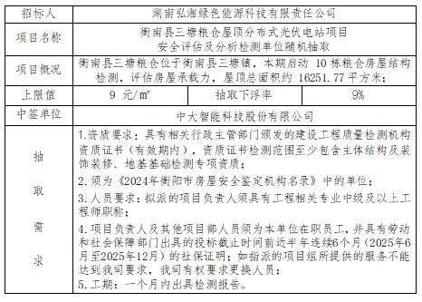 衡南縣三塘糧倉屋頂分布式光伏電站項(xiàng)目安全評(píng)估及分析檢測(cè)單位隨機(jī)抽取結(jié)果公示