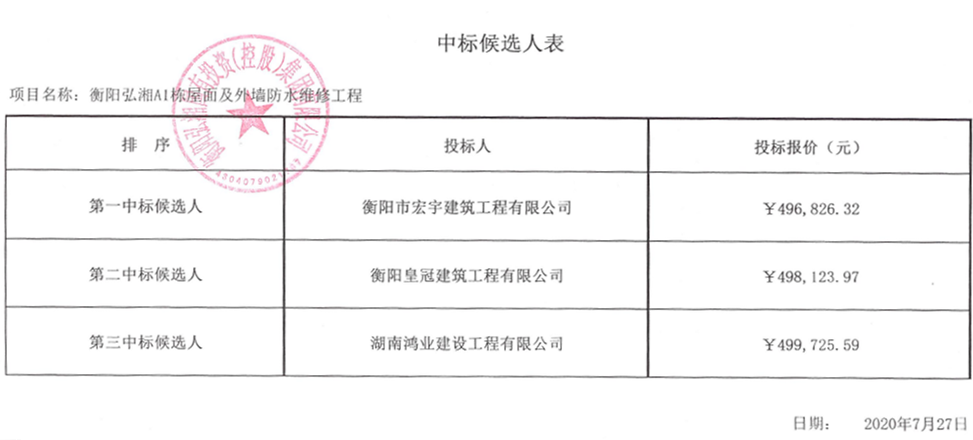 衡陽(yáng)弘湘A1棟屋面及外墻防水維修工程中標候選人公布